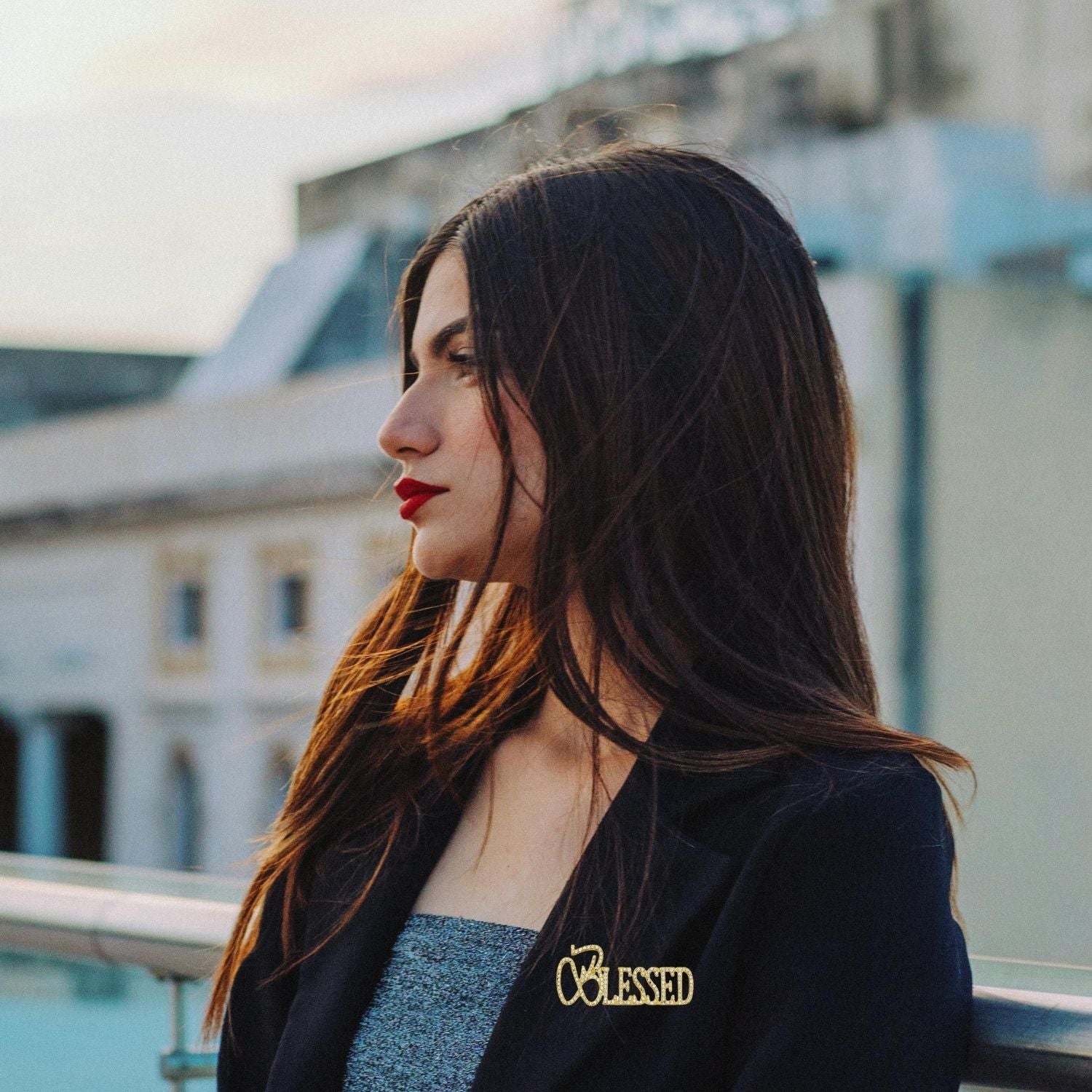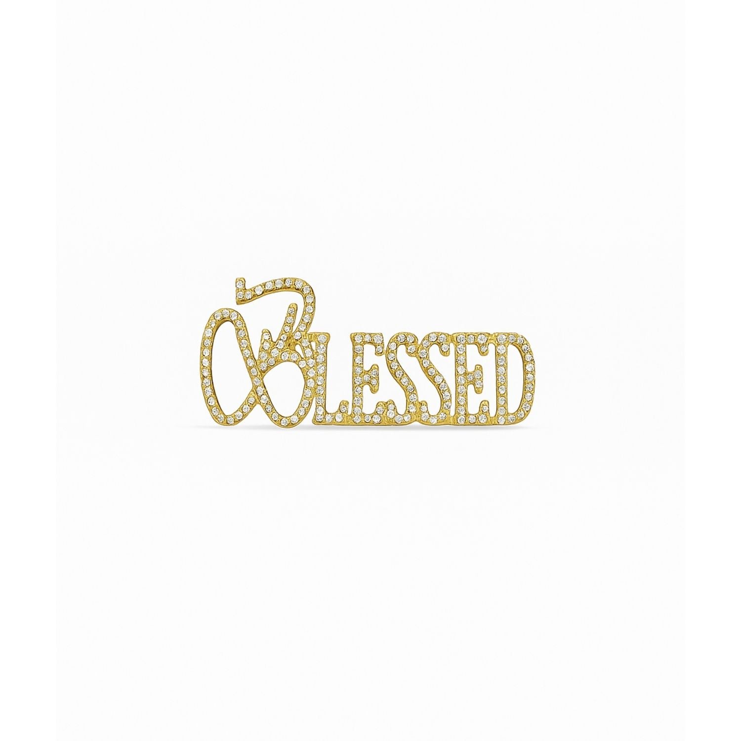 A sparkling reminder of gratitude, this “Blessed” handmade brooch features rhinestone-studded lettering in a graceful script-meets-block design. Approximately 1" x 3". Finished with a gold clasp on the back.