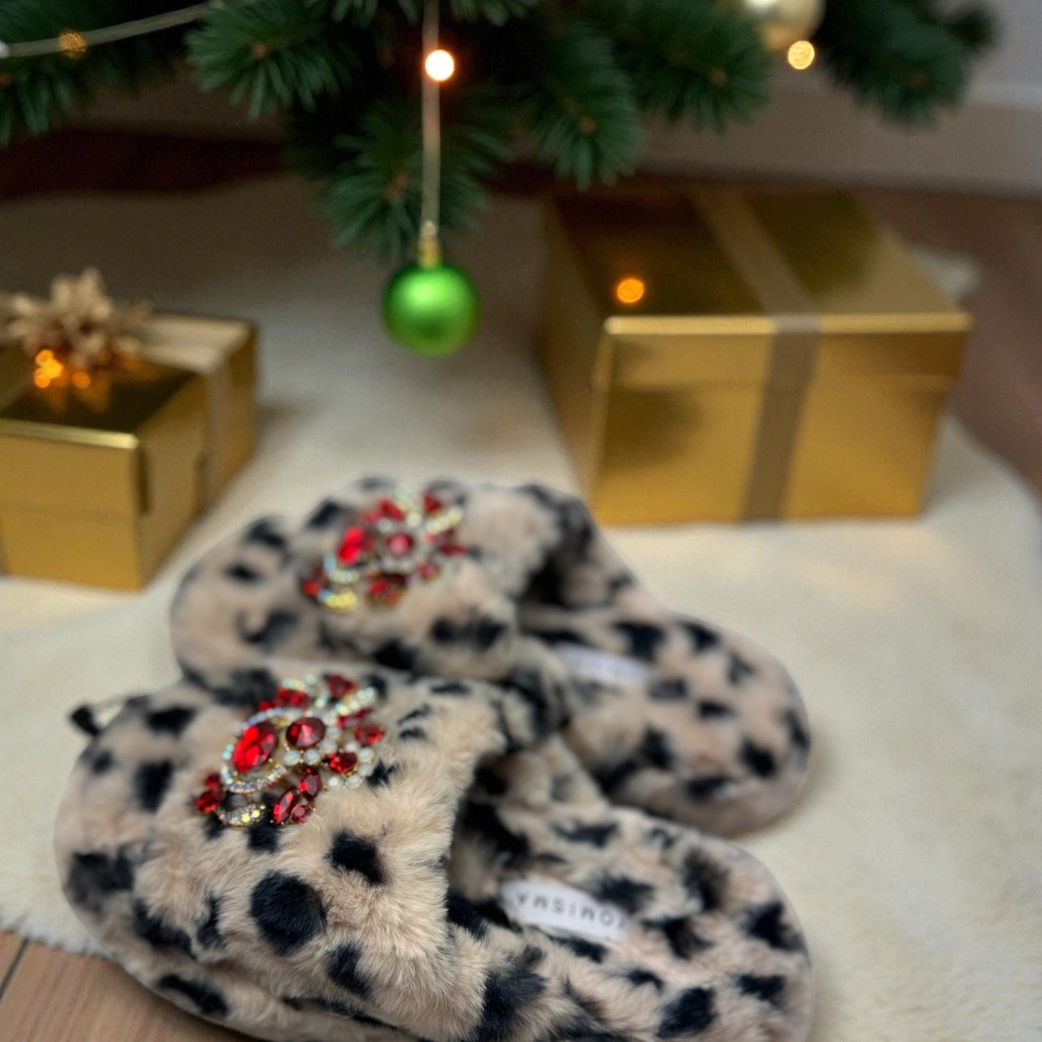 Eco Faux Fur Cheetah Platform Slide Slippers with Red and Clear Brooches