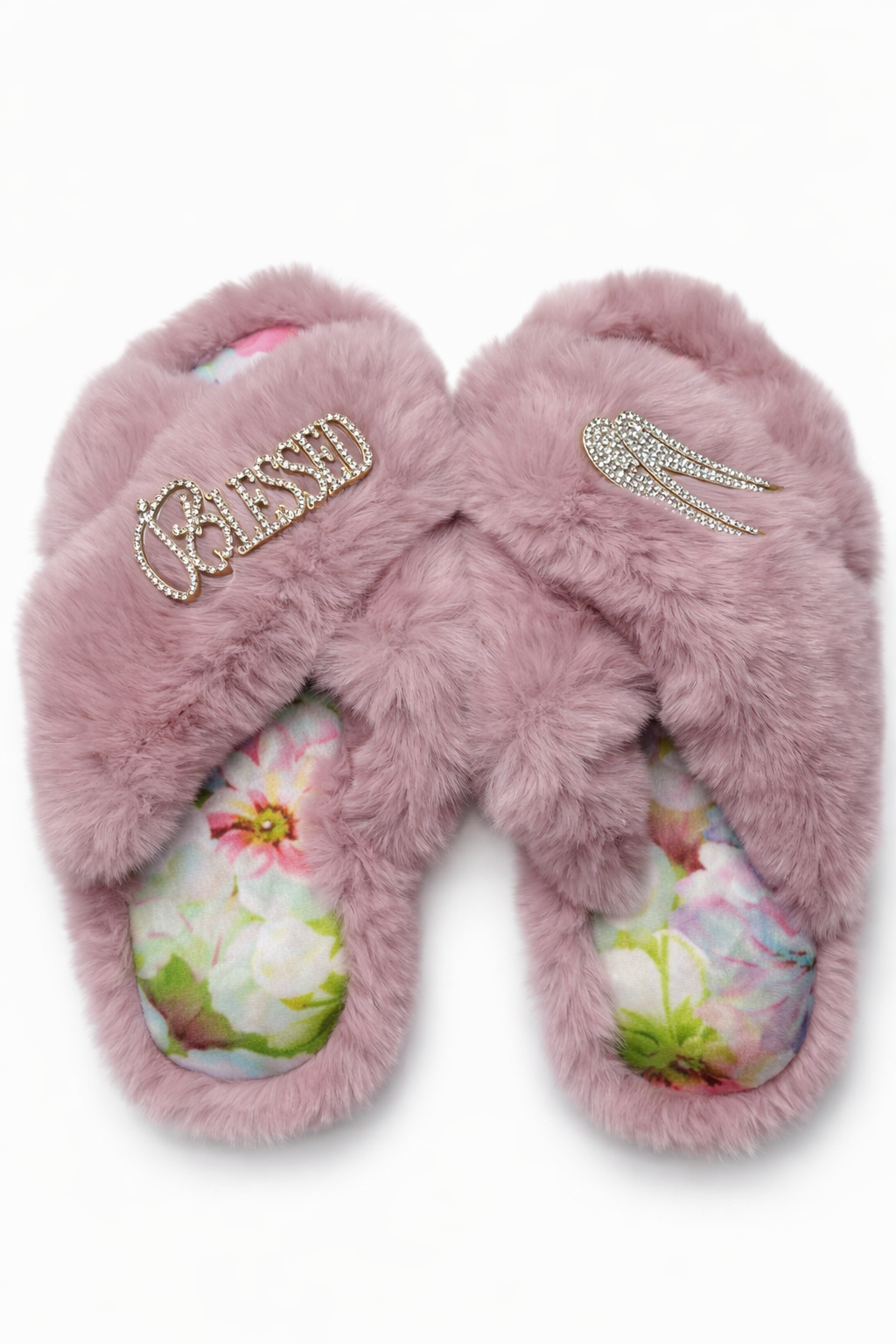 Faux Fur Slippers - Global Recycled Standard Certified with Blessed + Angel Wing Embellishment