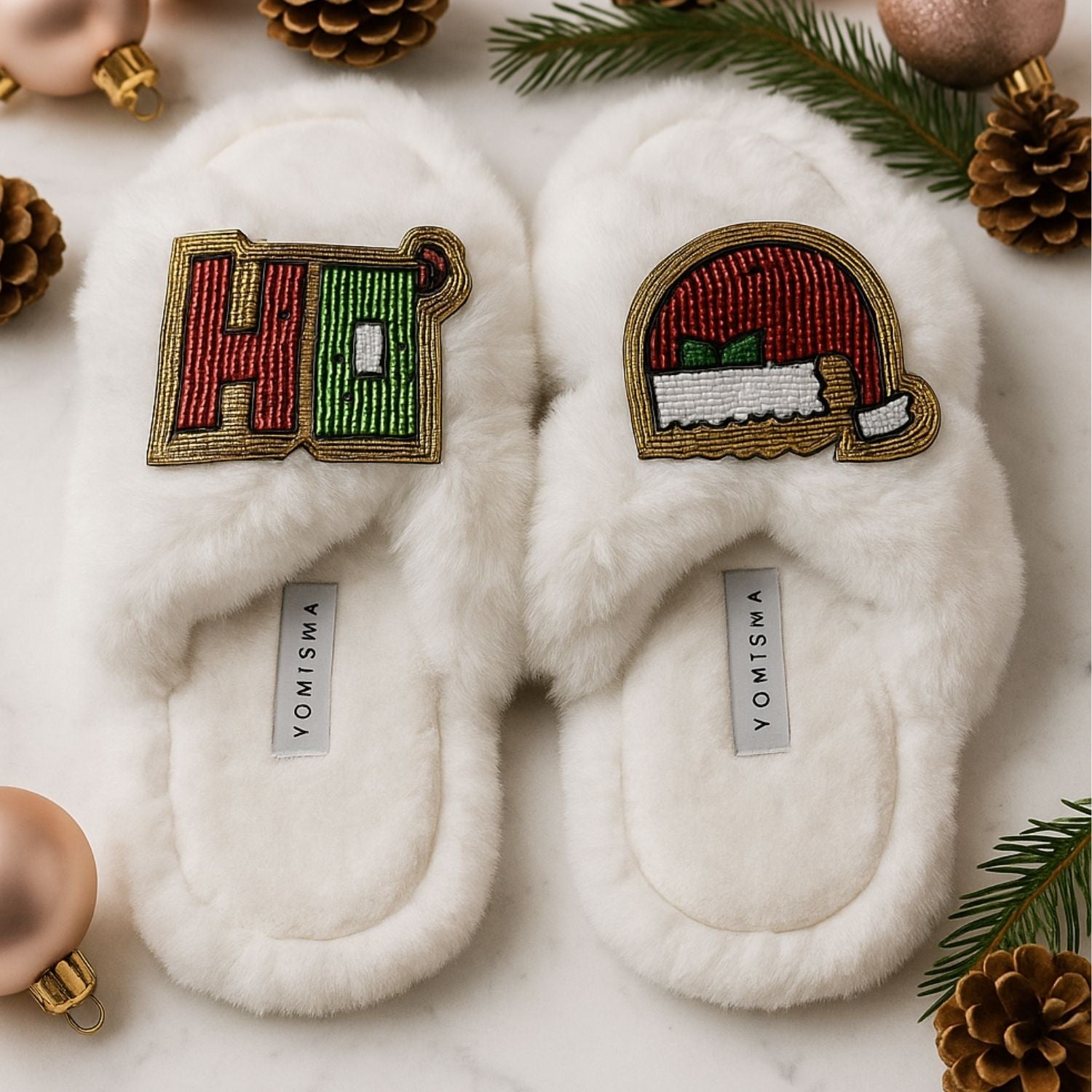 Faux Fur Slippers - Global Recycled Standard Certified with HO3 + Santa Hat Hand Beaded Brooches