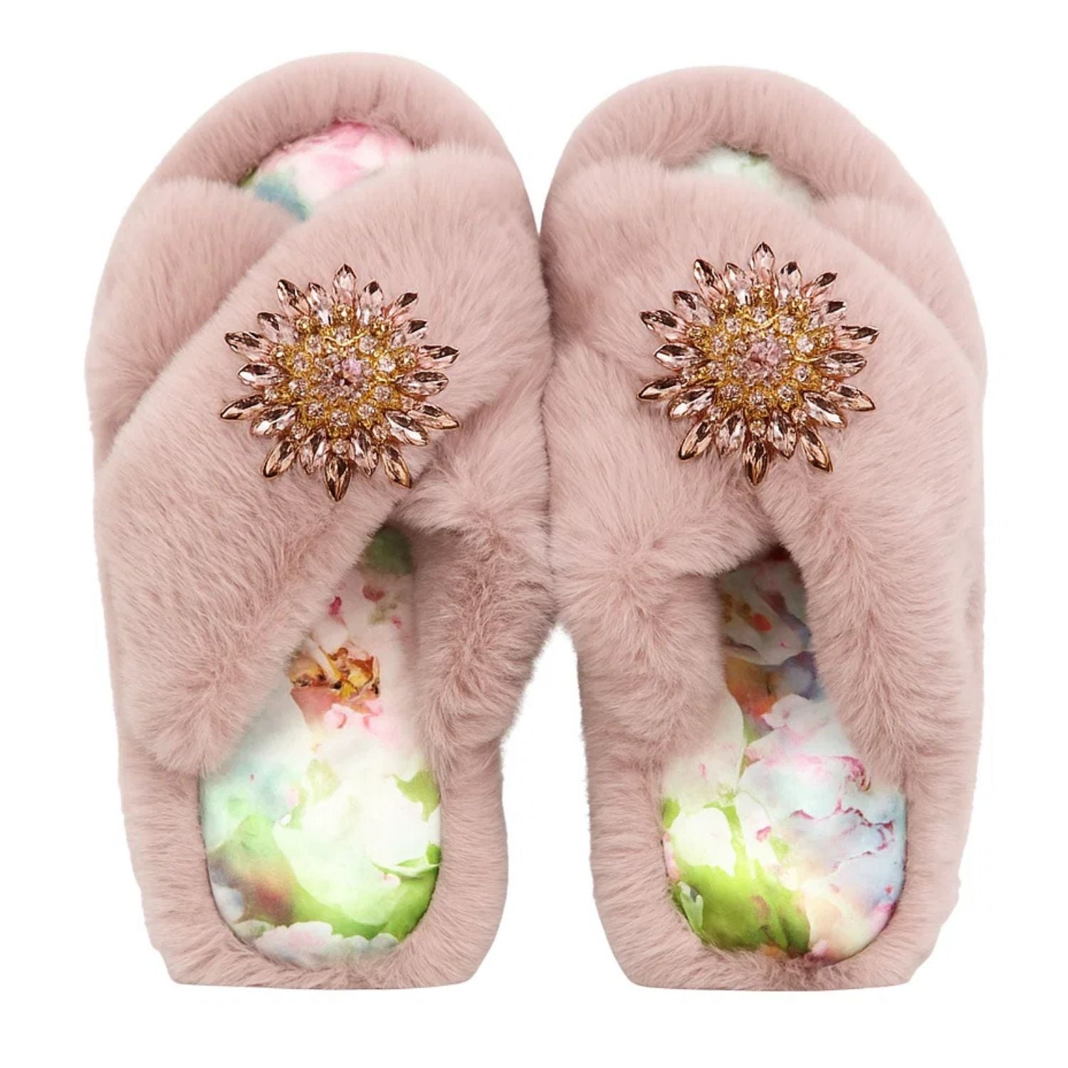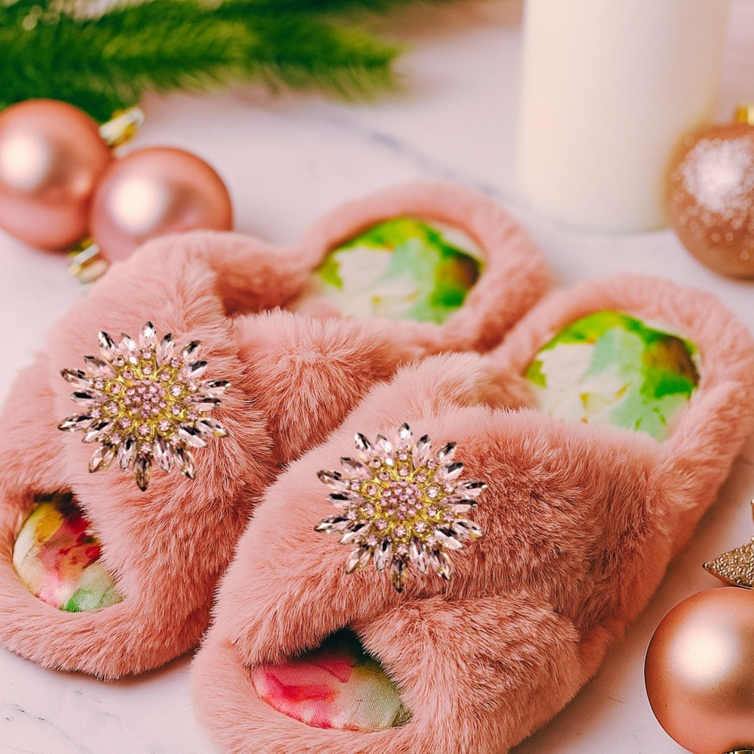 Faux Fur Slippers - Global Recycled Standard Certified with Light Pink Jewel Embellishments