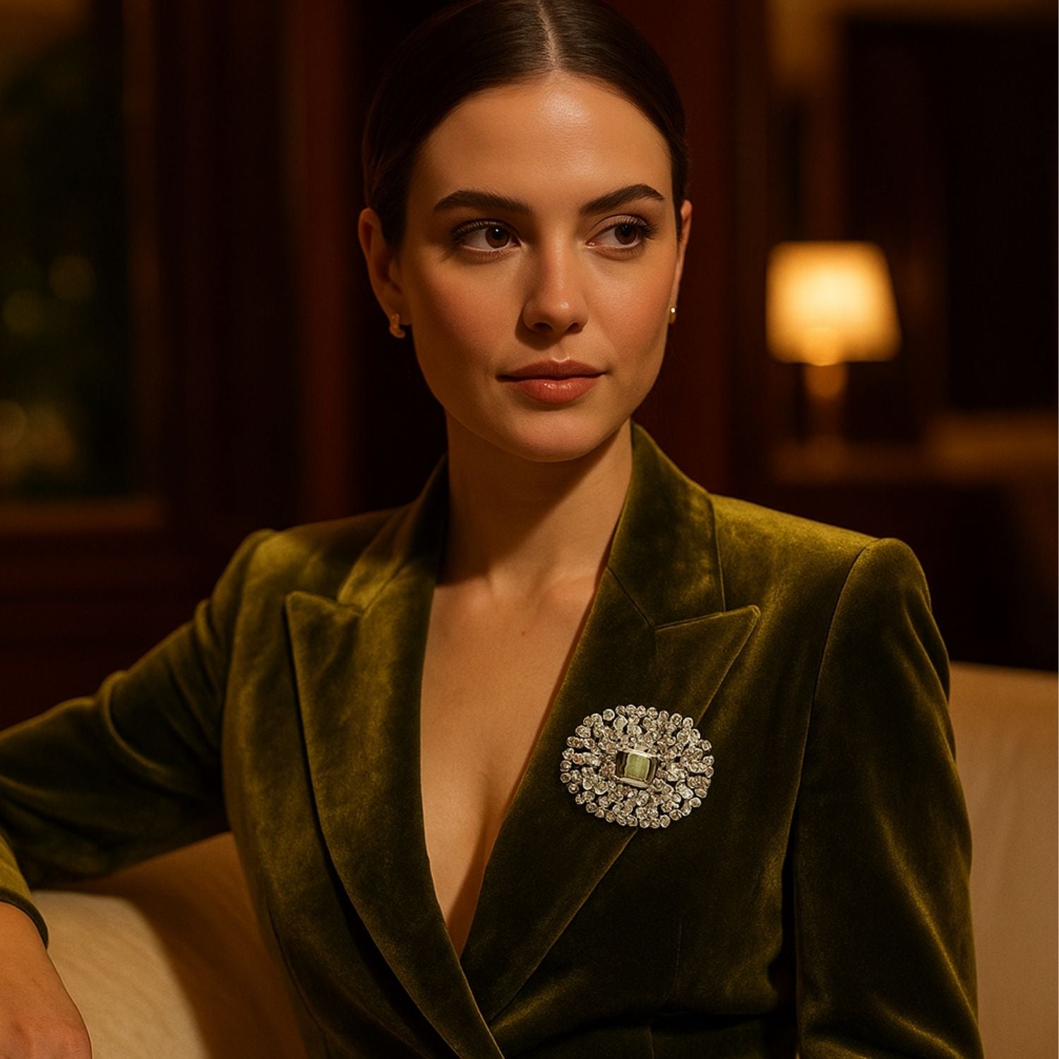 A show-stopping oval brooch featuring an emerald-cut iridescent center stone surrounded by marquise and round rhinestones. This radiant piece measures 3" wide and 2" tall and shifts color beautifully in the light. Set in silver hardware with a sturdy clasp back.