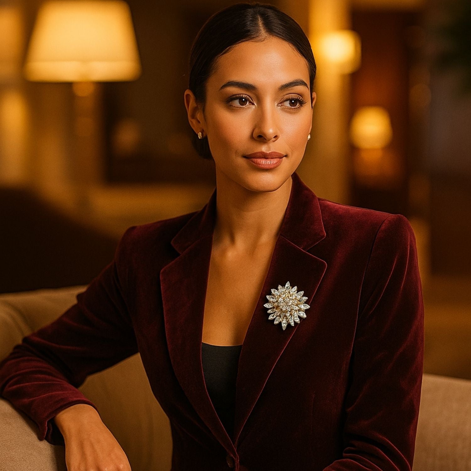 A radiant burst of marquise-cut rhinestones arranged in a layered sunburst design. Measuring approximately 2" x 2", this sparkling statement piece adds timeless glamour to any look. Clear color. Finished with a secure gold clasp.