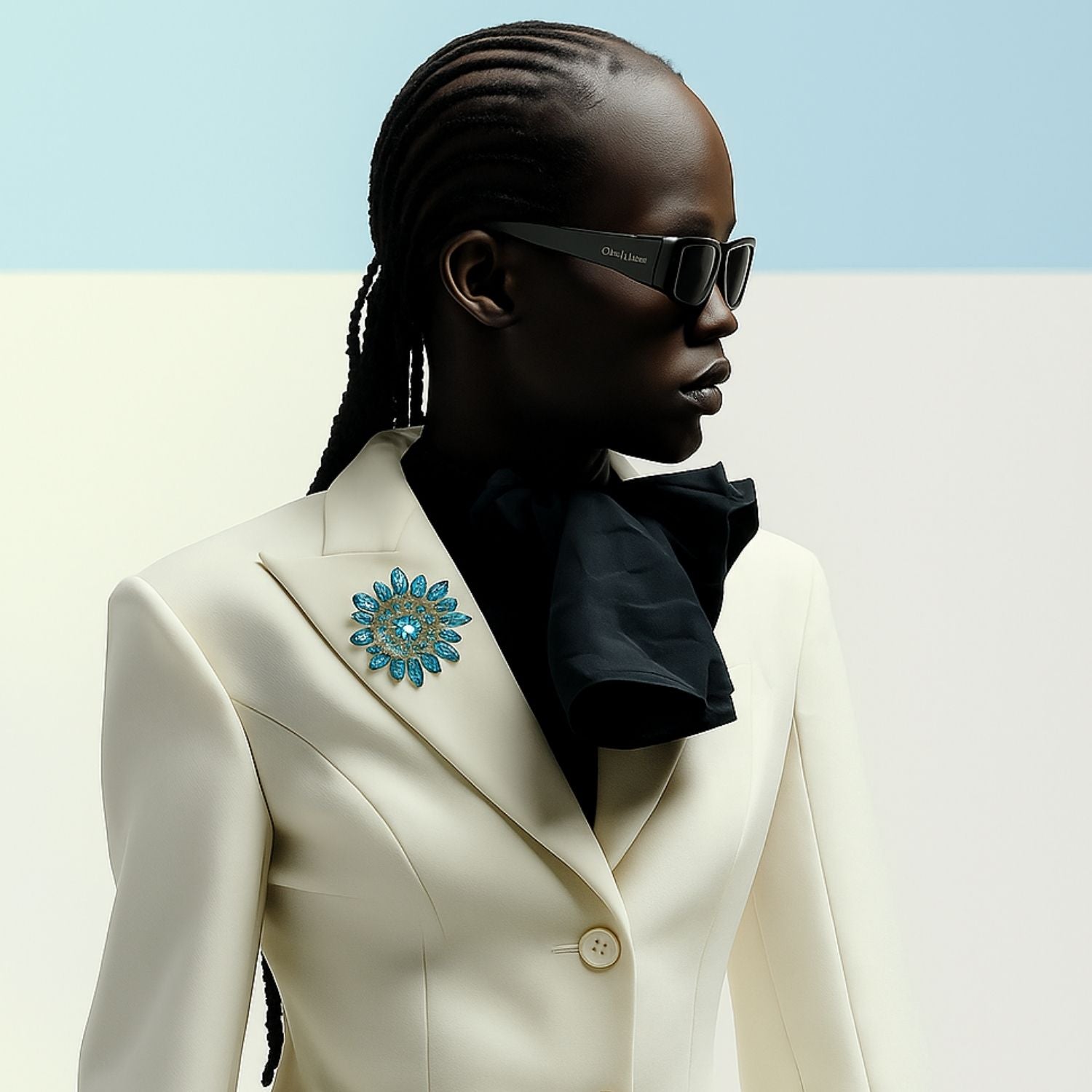 A radiant burst of marquise-cut rhinestones arranged in a layered sunburst design. Measuring approximately 2" x 2", this sparkling statement piece adds timeless glamour to any look. Turquoise color. Finished with a secure gold clasp.