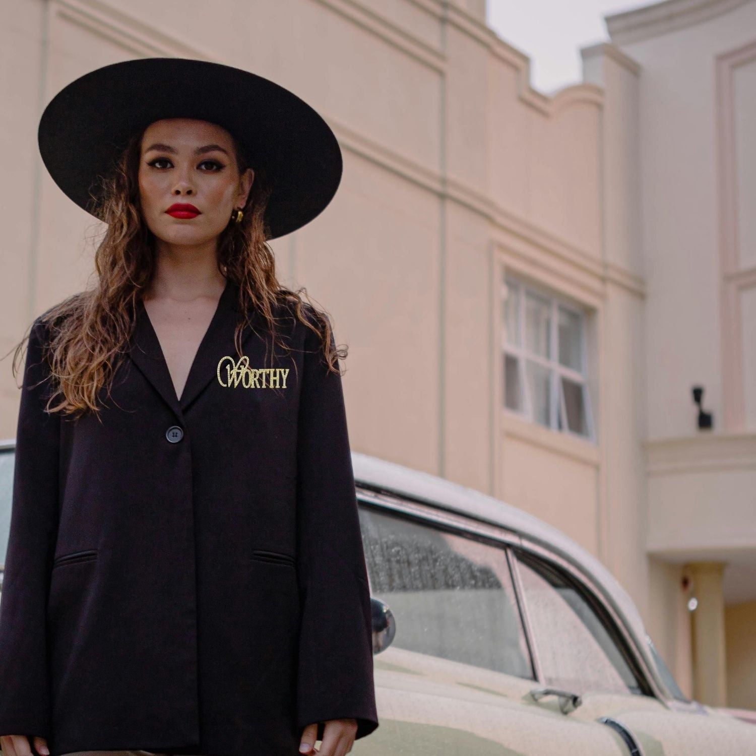 A meaningful, sparkling handmade statement piece, this “Worthy” brooch pairs elegant script with bold lettering. Around 1" x 3" in size, with a shimmering gold clasp backing.